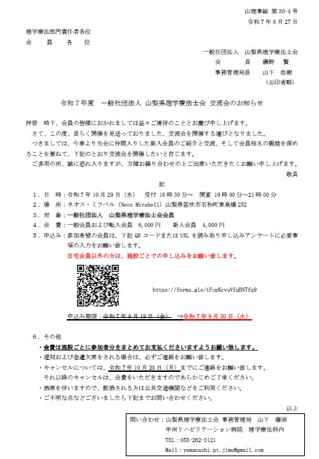 山梨県理学療法士会トップ > 山梨県理学療法士会からのお知らせ > 令和7年度 一般社団法人 山梨県理学療法士会 交流会の申し込み期限延長のお知らせ