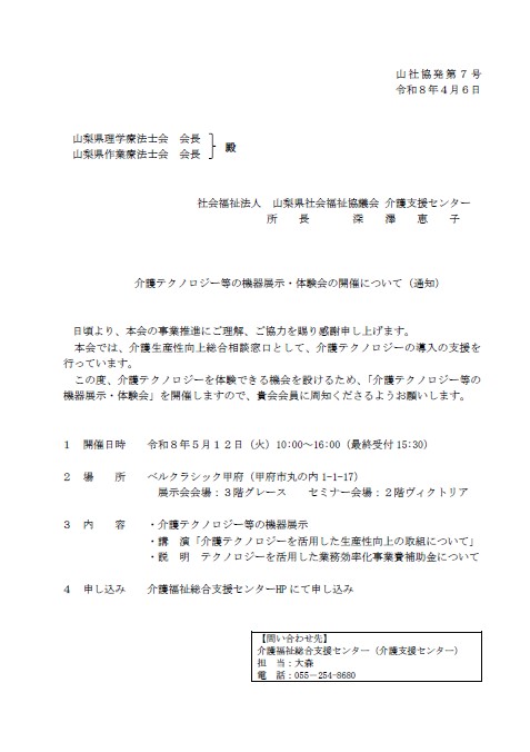 山梨県理学療法士会トップ > 研修会情報 > 令和8年度介護テクノロジーの機器展示・体験会について