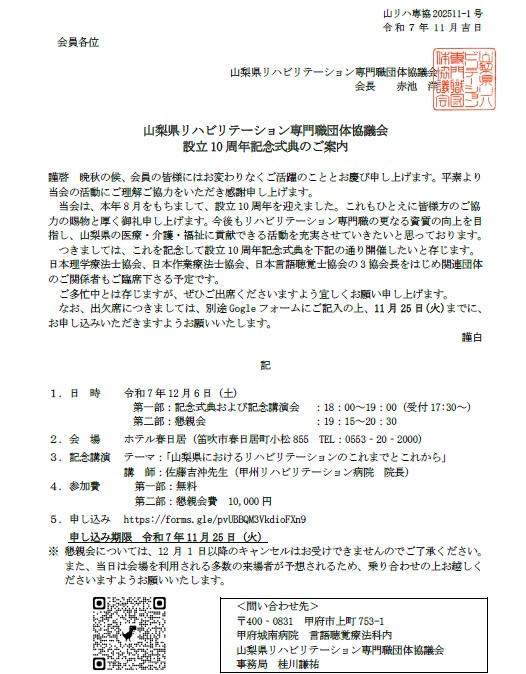 11-1 山梨リハ専門職団体協議会設立10周年記念式典ご案内