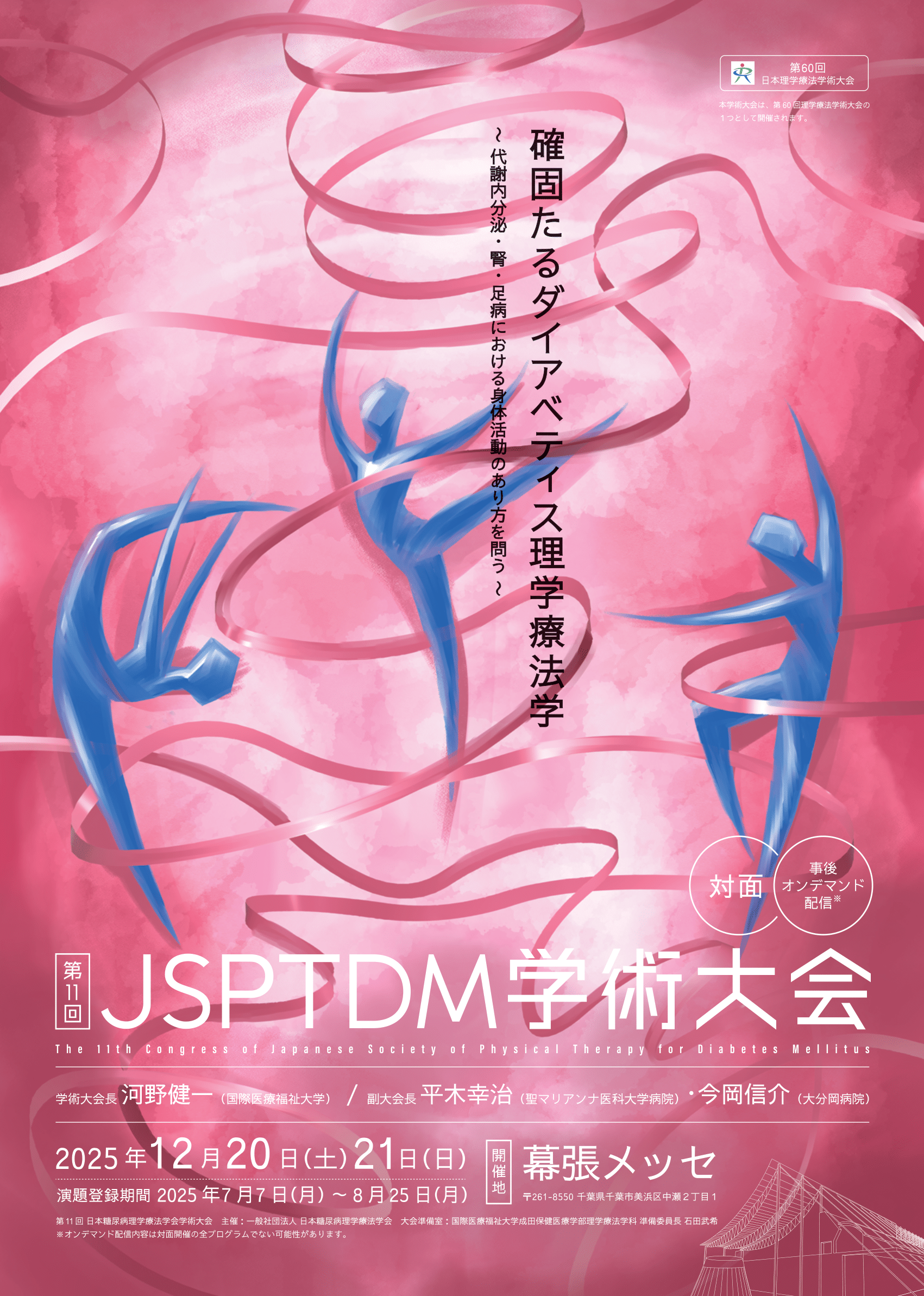 開催概要日時:2025年12月20-21日会場:幕張メッセ学術大会長:河野健一(国際医療福祉大学 福岡保健医療学部 理学療法学科 学科長 大学院医療福祉学研究科 理学療法学分野 教授)【現地参加+オンデマンド】セミナーID:149538 開催期間:2025年12月20-21日 参加費:8,000円【オンデマンドのみ参加】セミナーID:149542 開催期間:2026年01月09日 12時00分 ~ 2026年01月30日 12時00分 参加参加費:6,000円今大会は、糖尿病を中心に合併症を有する方含め、いかに身体活動を高めていくか?ということを主テーマに設定し、充実したプログラムを企画しています.第11回大会へのご参加心よりお願い申し上げます.HP:https://pub.confit.atlas.jp/ja/event/jsptdm11