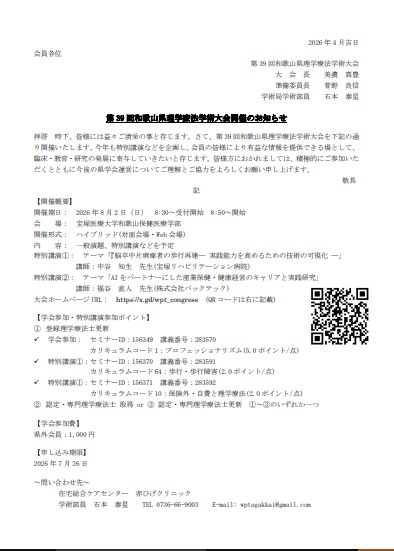 第39回和歌山県理学療法学術大会についての案内がありました。