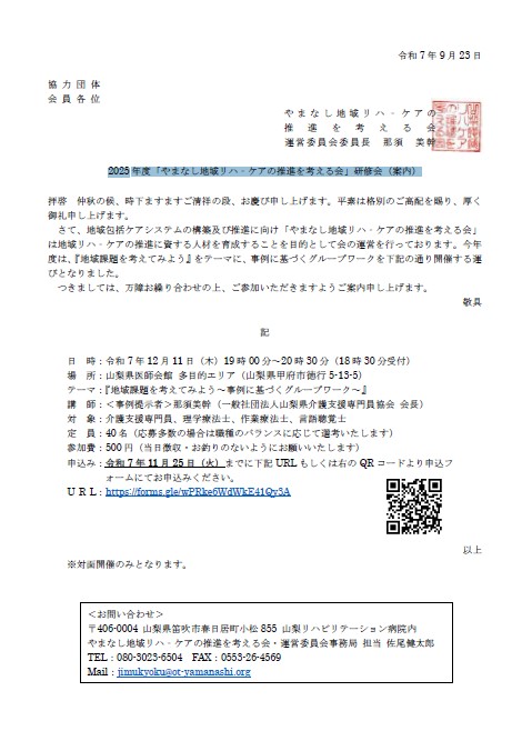 2025 年度「やまなし地域リハ‐ケアの推進を考える会」研修会(案内)がありました。